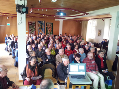 Depuis le 17e siècle la communauté bénédictine anime la vie conventuelle. L'accueil dans l'élégante basilique baroque, suivi de la prière de midi avec la quinzaine de moines, nous a offert la nourriture spirituelle, puis la soupe goulash et la tourte aux framboises ont agréablement comblé nos besoins terrestres. Les bus nous ont ramenés à Bâle, au "Bürgerliches Waisenhaus", où la Salle des Chartreux (où les moines occupaient les cellules puis encadrèrent aussi, dès le 17e siècle, de jeunes délinquants) accueillit notre Assemblée générale qui se déroula en toute harmonie : une minute de silence en mémoire des membres disparus ; 2606 membres de l'Association en février 2013; comptes et budget acceptés à l'unanimité ; cotisations inchangées ; et la " révolution " annoncée, avec un comité de 7 membres (pour les fonctions les plus en vue) se ramena à un aménagement ... très helvétique, avec réélection du comité actuel. |