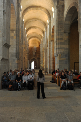 | Une petite heure de marche plus tard, revenus en pays vaudois, nous quittions la Broye pour la vieille ville de Payerne et sa magnifique abbatiale toute dorée par la lumière d'automne. Mme Lydie Zimmermann, guide, nous emmena aussitôt à la découverte des merveilles du lieu (histoire, architecture, fresques, chapiteaux) en un commentaire très apprécié, à la fois informatif et anecdotique. | ||