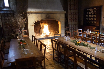 La marche se poursuit, silencieuse, jusquaux portes de Romainmôtier dont nous découvrons labbatiale toute dorée sous le soleil dautomne, et, tout près de là, la Maison du Prieur, où nous attend... Jésus en personne ! En effet, M. Jesus Queijas, maître de céans, nous présente lhistoire haute en couleur de cet édifice médiéval dont la valeur, autrefois méconnue, a été révélée par sa courageuse propriétaire Katharina von Arx (journaliste, écrivaine, décédée en 2013) dès les années 1960 et à qui de judicieuses restaurations ont rendu sa splendeur première. Son actuelle gestion est le fait de lAssociation Clef de Voûte, dont Mme Queijas est présidente. Jesus nous fait les honneurs de « sa » maison par un commentaire engagé et sensible et ... surprise ! Un grand feu nous attend dans la salle des Chevaliers du rez-de-chaussée, ainsi quun buffet pèlerin de grande classe, cest-à-dire simple, du terroir, et délicieux: soupe à la courge, pain paysan maison, choix de fromages locaux, et choix de tartes fraîchement sorties du four du tea-room installé au rez-de-chaussée. |